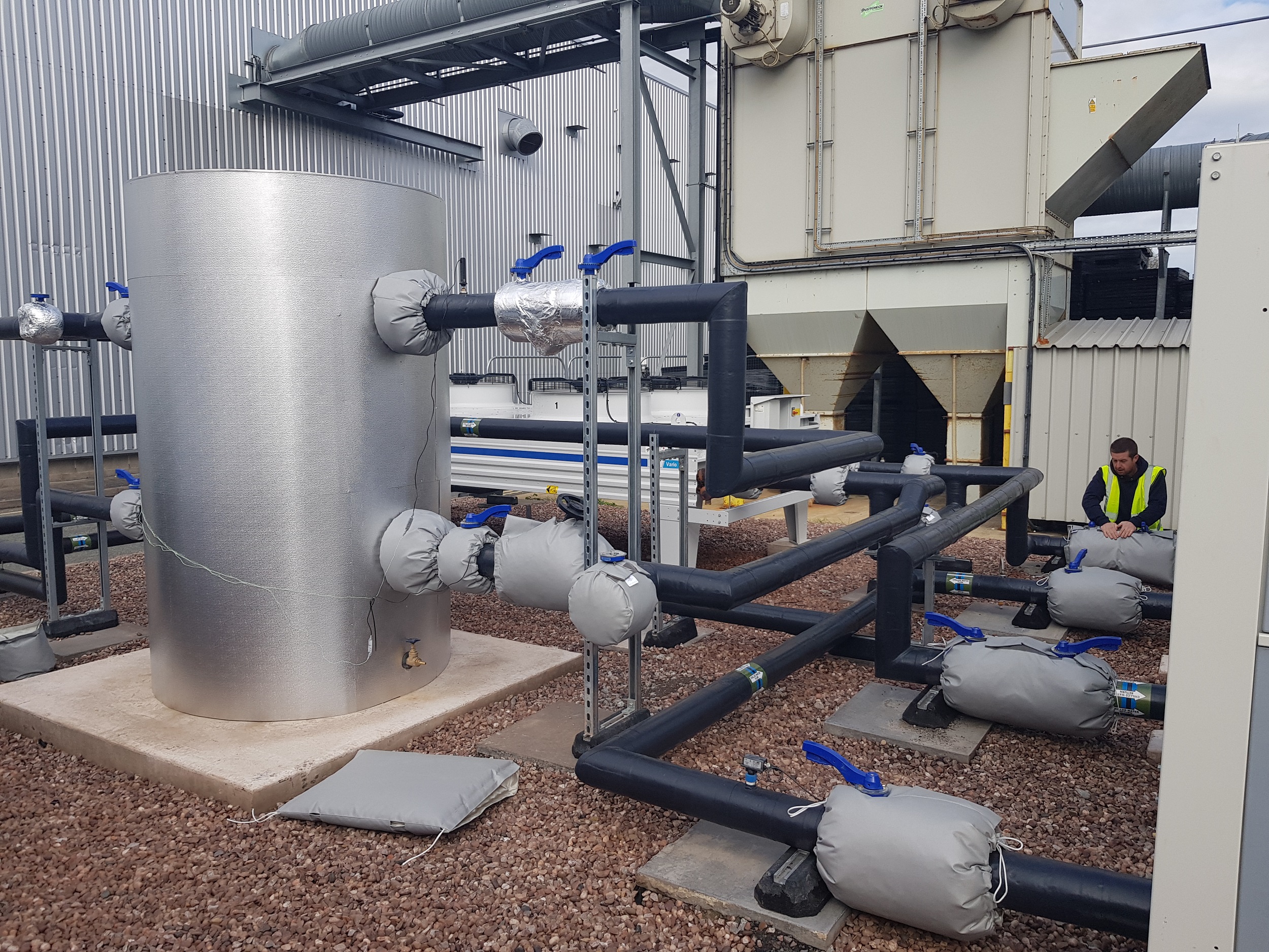 A client in Wednesbury required a full design, supply and installation of two new 200kw air cooled chillers, complete with scroll compressors and a 515 litre buffer tank alongside a 200kw dry air cooler. Design parameters were set at 10°c flow, 15° return and 35°c ambient with water/glycol at 25%. With the system designed, the installation had to be completed on time, on budget and allowed plant to open within programme. Complete with BMS integration and remote monitoring, the client can now monitor their complete system. The dry cooler provides free cooling when the external ambient is below the chilled water design temperatures, thus eliminating completely compressor operation during long periods – i.e winter.